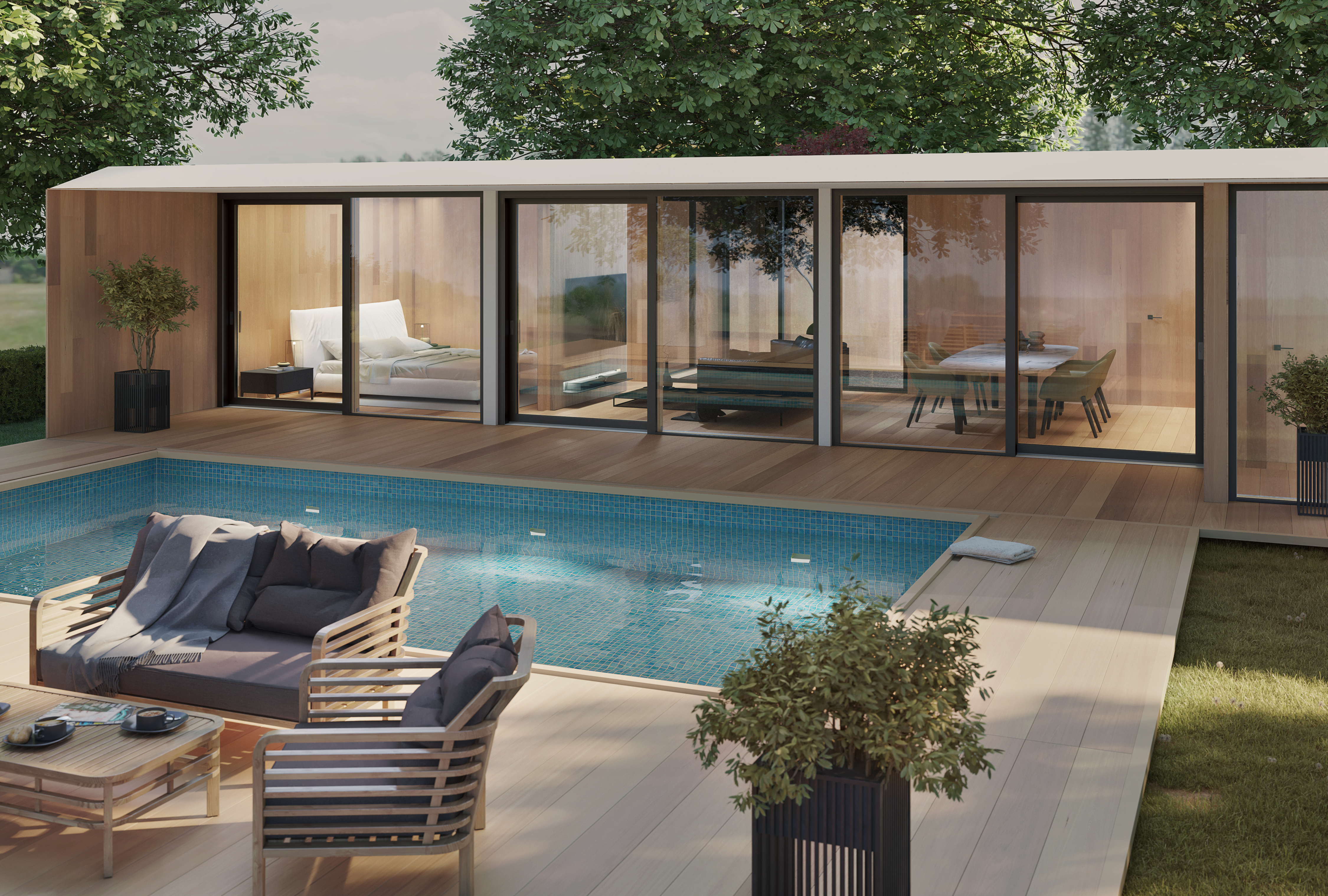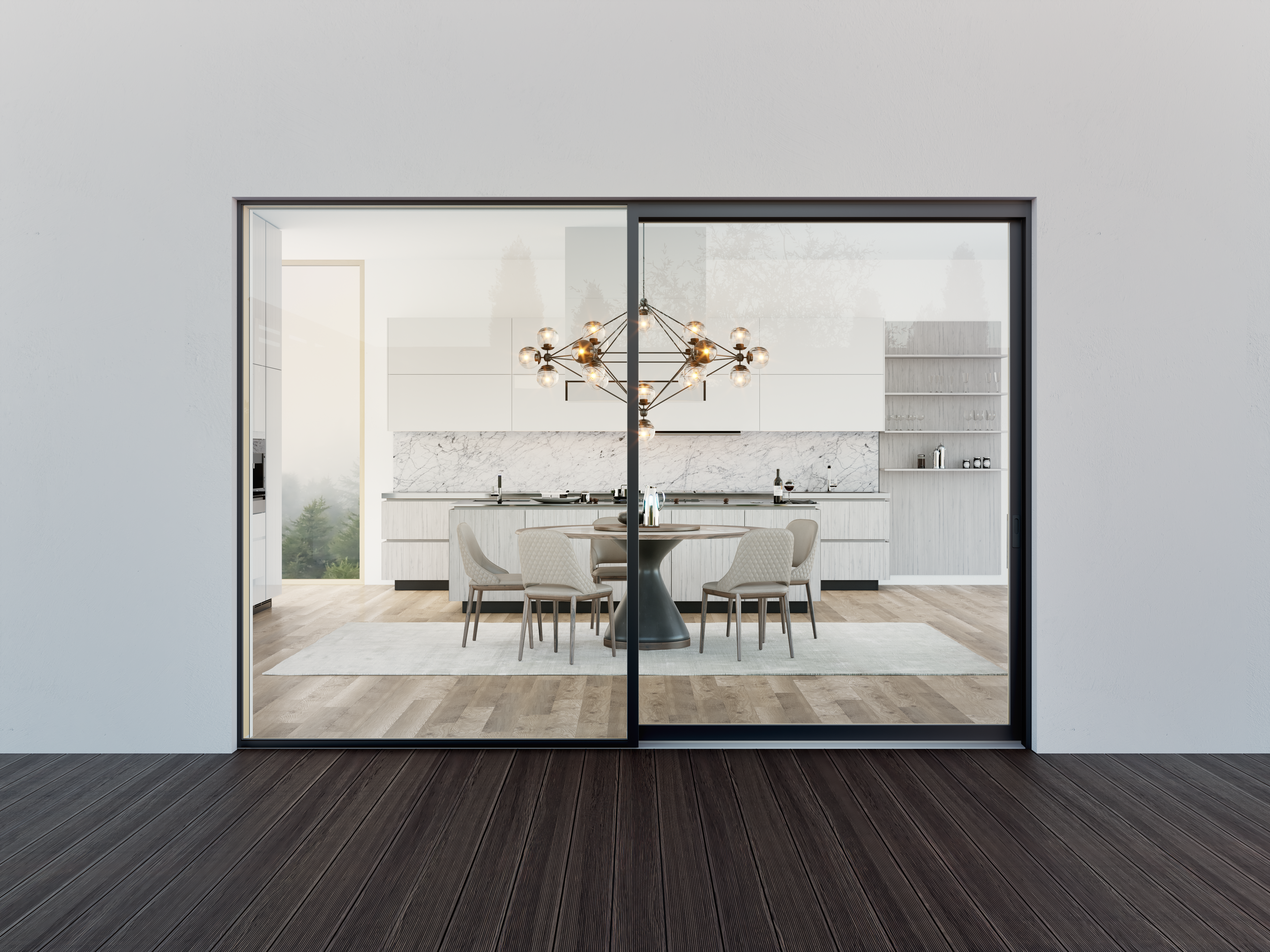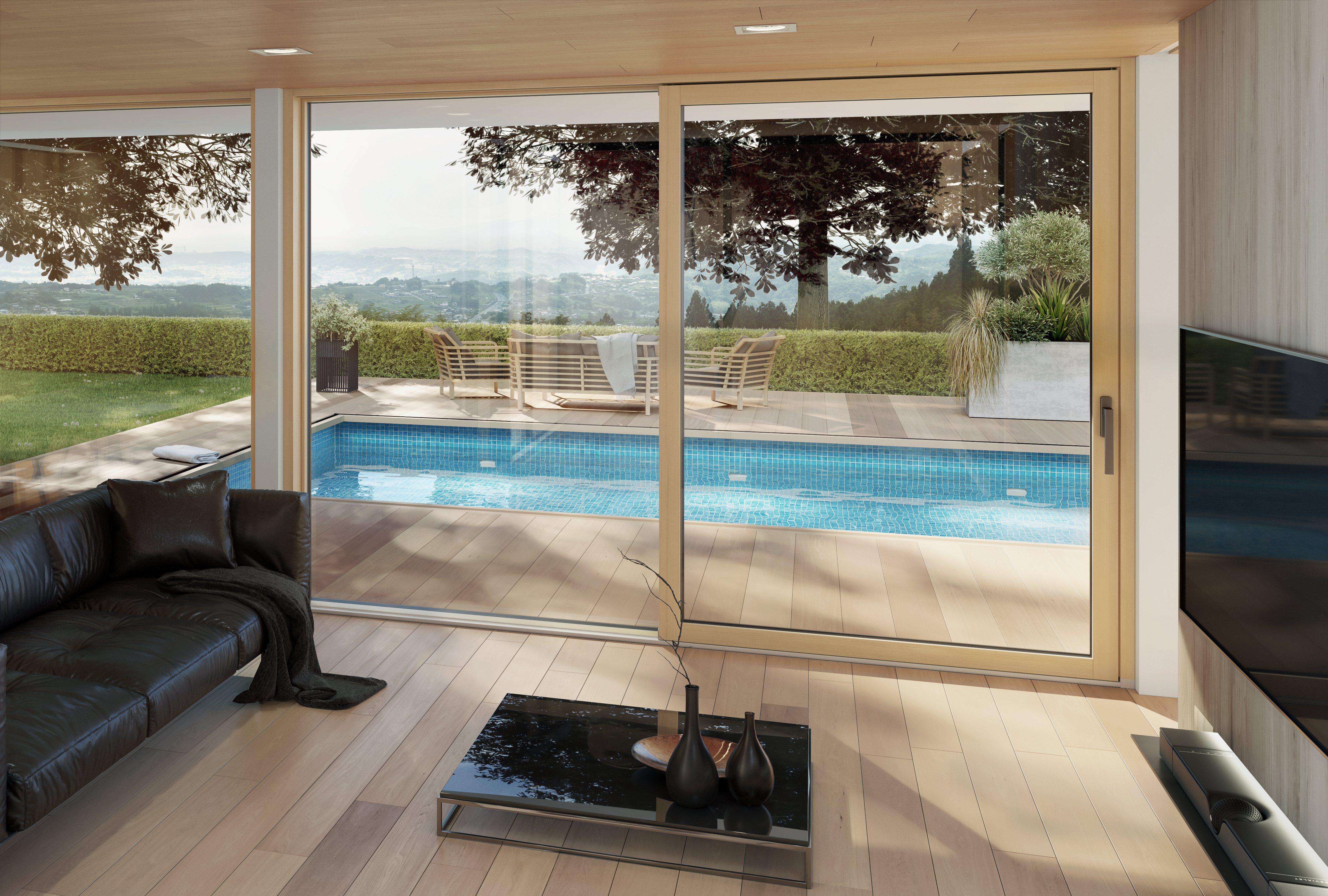 Maximale Glasflächen für ein offenes Wohngefühl: Die Panorama-Schiebetüren überzeugen mit elegantem Design, schlanken Profilen und bester Wärmedämmung – für lichtdurchflutete Räume und freie Sicht nach draußen.